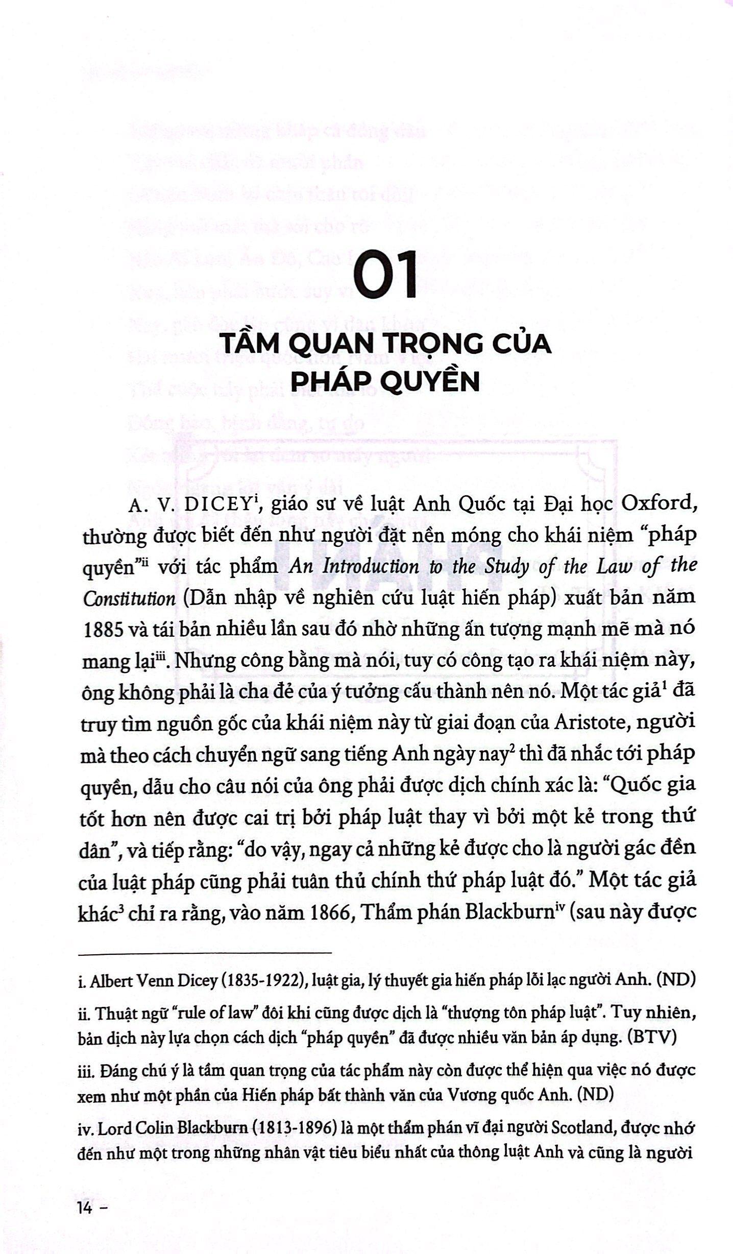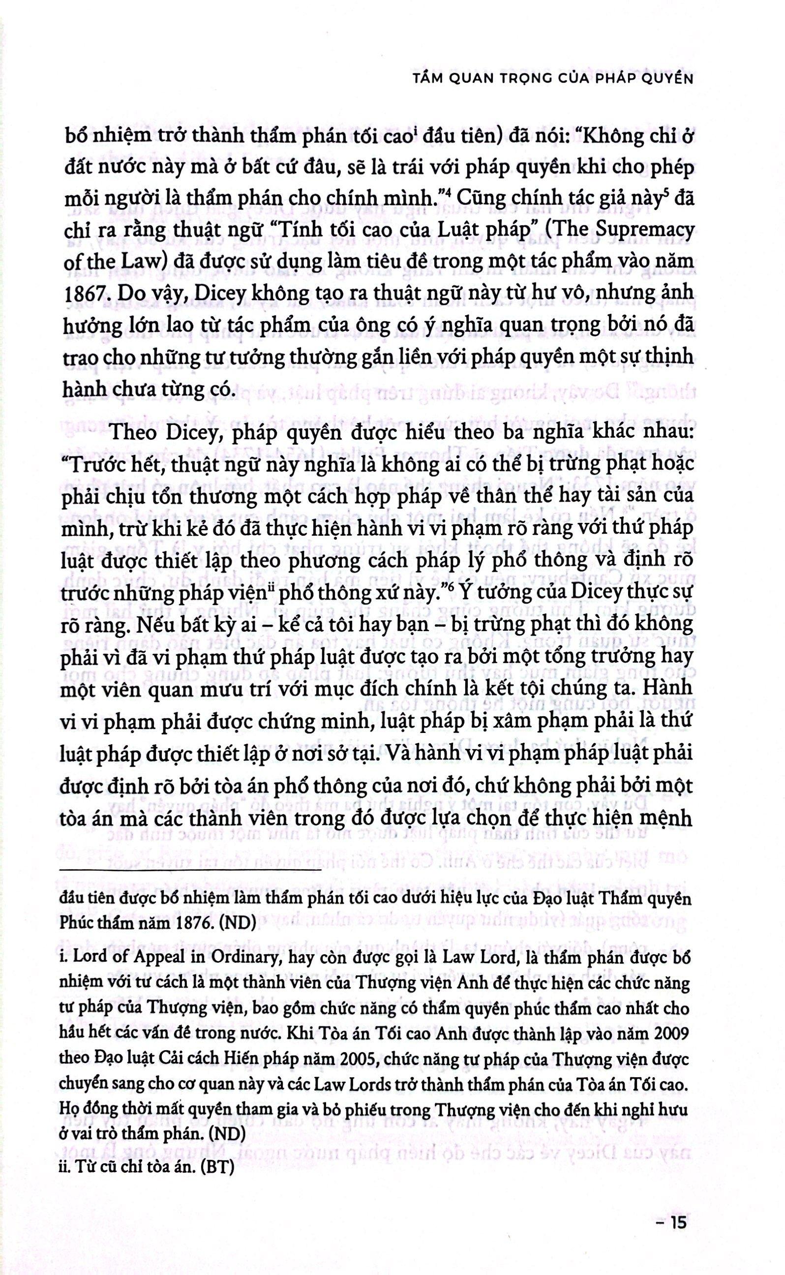 Mua tại TiktokVề Pháp Quyền Trong “Về Pháp Quyền”, Tom Bingham, một trong những bộ óc sắc bén nhất thế giới về pháp lý, đã bàn luận về ý nghĩa của pháp quyền. Theo ông, pháp quyền không phải là một học thuyết pháp lý khô khan mà là nền tảng thực sự của một xã hội công bằng, là sự bảo đảm của một chính phủ có trách nhiệm, có đóng góp quan trọng cho sự phát triển kinh tế, đồng thời cũng góp phần đàm bảo hòa bình và sự hợp tác giữa các quốc gia. Cuốn sách trình bày ngắn gọn về lịch sử của nguyên tắc pháp quyền, tám yếu tố cơ bản tóm gọn bản chất của khái niệm này, đồng thời thảo luận về những căng thằng đối với pháp quyền đến từ chủ nghĩa khủng bố quốc tế. Sách có ba phần chính: