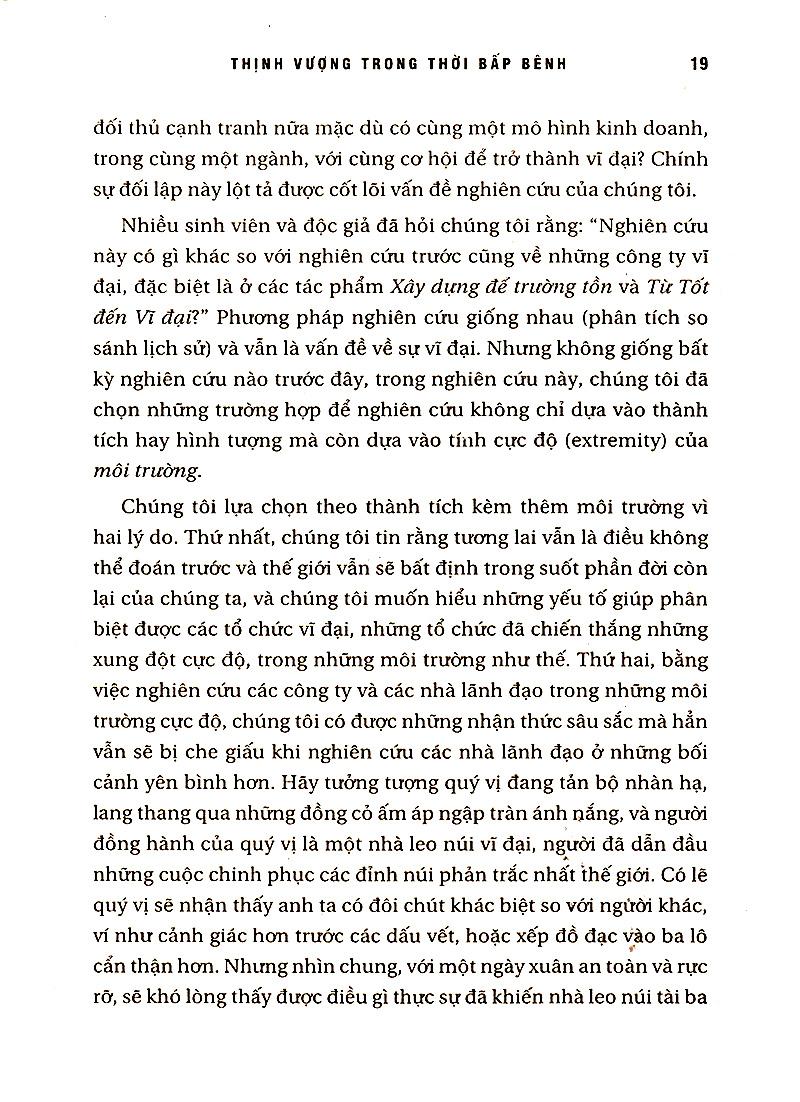 Jim Collins là tác giả của hai đầu sách nổi tiếng - Từ tốt đến vĩ đại và Xây dựng để trường tồn. Cùng với phương pháp nghiên cứu như hai cuốn đầu tiên, trong quyển sách này, Jim Collins cùng với Morten T. Hansen đi tìm câu trả lời cho câu hỏi, tại sao các công ty vĩ đại vẫn trường tồn trong những lúc khó khăn, hỗn loạn. Qua rất nhiều năm nghiên cứu khoa học từ những công ty và các lãnh đạo hàng đầu, hai tác giả rút ra được kết luận rằng: Chúng tôi không tin cuộc sống sẽ trở nên tốt đẹp hơn hay có một phép nhiệm mầu và đoán định được tương lai, nhưng có thể nói nhữg tác động phức tạp, toàn cầu hóa và công nghệ đang thúc đẩy thay đổi và càng dễ bị thay đổi hơn bao giờ hết. Chúng tôi cảm thấy trấn tĩnh vì chúng tôi đã hiểu hơn phải có những gì để sống sót, lèo lái và chiến thắng. Theo chúng tôi, trường tồn và tiêu vong phụ thuộc vào những hành động của chúng ta hơn là những gì mà thế giới gây cho chúng ta; và sự vĩ đại không chỉ là một cuộc chinh phục về kinh doanh, nó là cuộc chinh phục của con người.