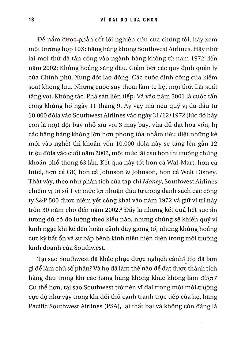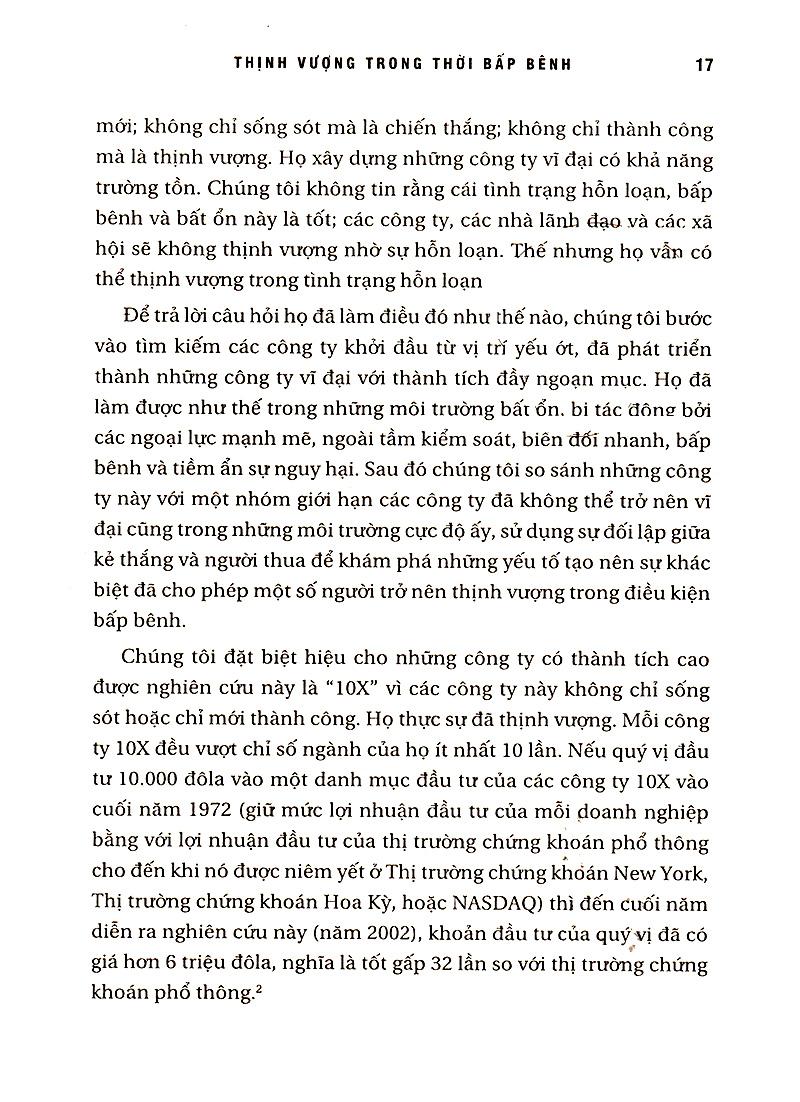 Và kết quả nghiên cứu sẽ gây bất ngờ cho nhiều nhà lãnh đạo các tổ chức đọc quyển sách này: Những nhà lãnh đạo của các công ty vĩ đại không sáng tạo hơn, không có tầm nhìn xa hơn, không có cá tính hơn, không có vận may hơn, không thích tìm kiếm rủi ro hơn, không anh hùng hơn, và không có khuynh hướng thực hiện những nước cờ lớn, táo bạo hơn. Nhưng họ đã lèo lái được công ty họ qua những lúc khó khăn để luôn trường tồn, bởi vì họ sống và làm việc theo ba yếu tố cân bằng nhau: kiên định với nguyên tắc, sáng tạo theo kinh nghiệm và biết sợ hãi một cách hữu ích.