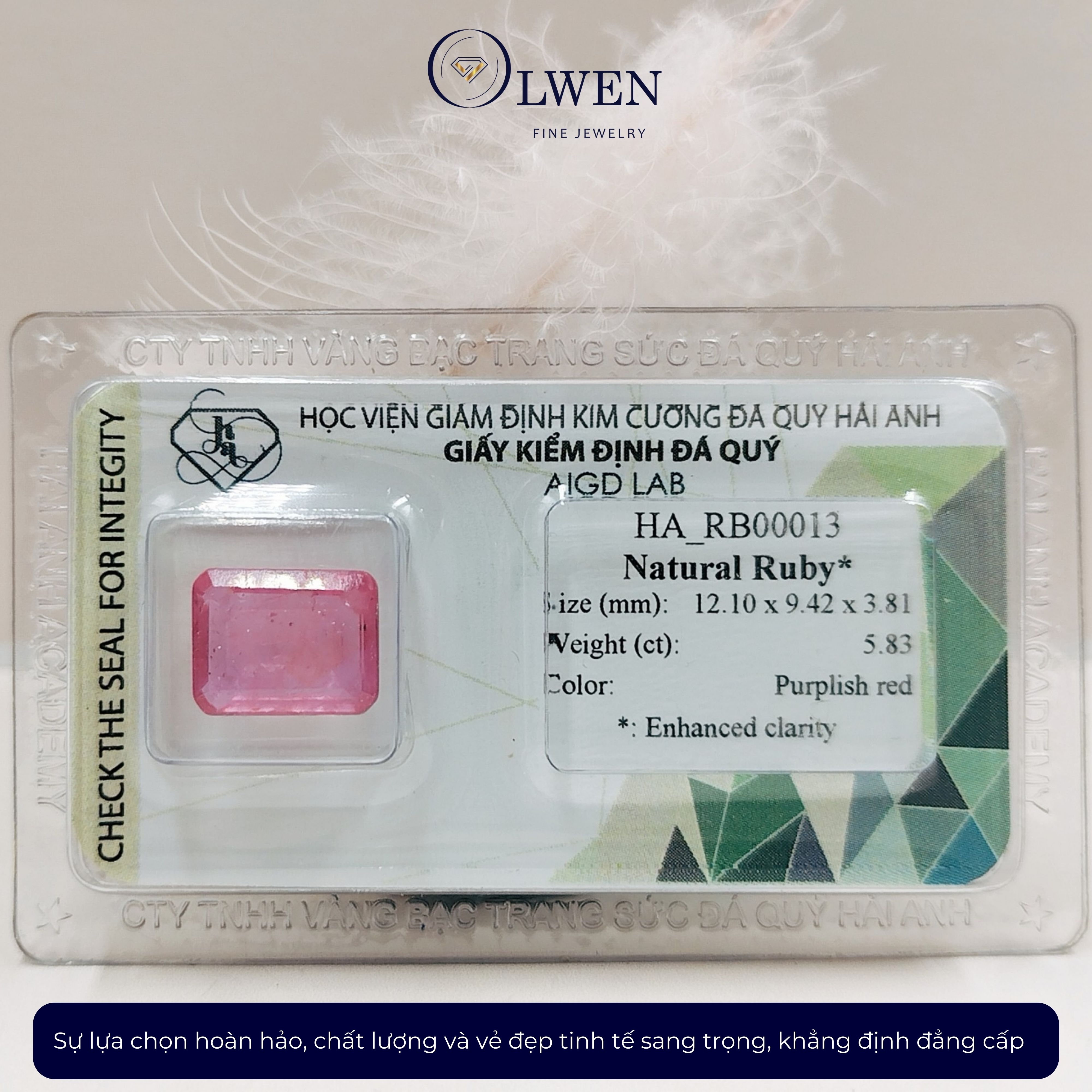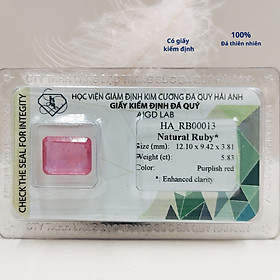 Mua tại TiktokVIÊN ĐÁ RUBY THIÊN NHIÊN_HA-RB00013 Tên sản phẩm: Viên đá Ruby thiên nhiên _HA-RB00013, đá phong thủy. Kích thước: 12.10 x 9.42 x 3.81 mm Trọng lượng: 5.83 cts Màu sắc: đỏ phớt tím CÔNG DỤNG CỦA MẶT RUBY Là một trong những loại đá hoàn hảo nhất, đá ruby (hồng ngọc) tượng trưng cho Mặt Trời, quyền lực, tự do, may mắn và vui vẻ. Nếu đeo gần tim thì viên đá này sẽ giúp cho tình yêu của bạn thêm mặn nồng. Ngoài ra nó còn giúp lưu thông máu và giúp ngủ ngon.