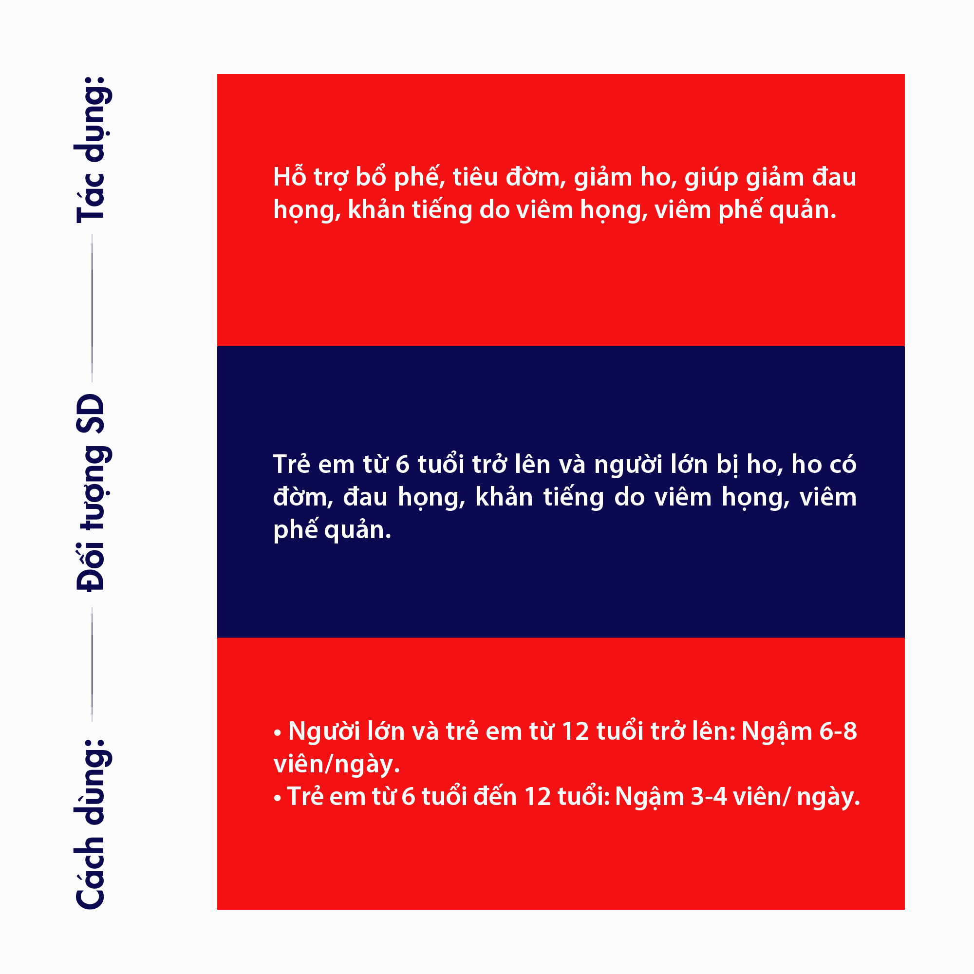 - ĐỐI TƯỢNG SỬ DỤNG Trẻ em từ 6 tuổi trở lên và người lớn bị ho, ho có đờm, đau họng, khản tiếng do viêm họng, viêm phế quản
