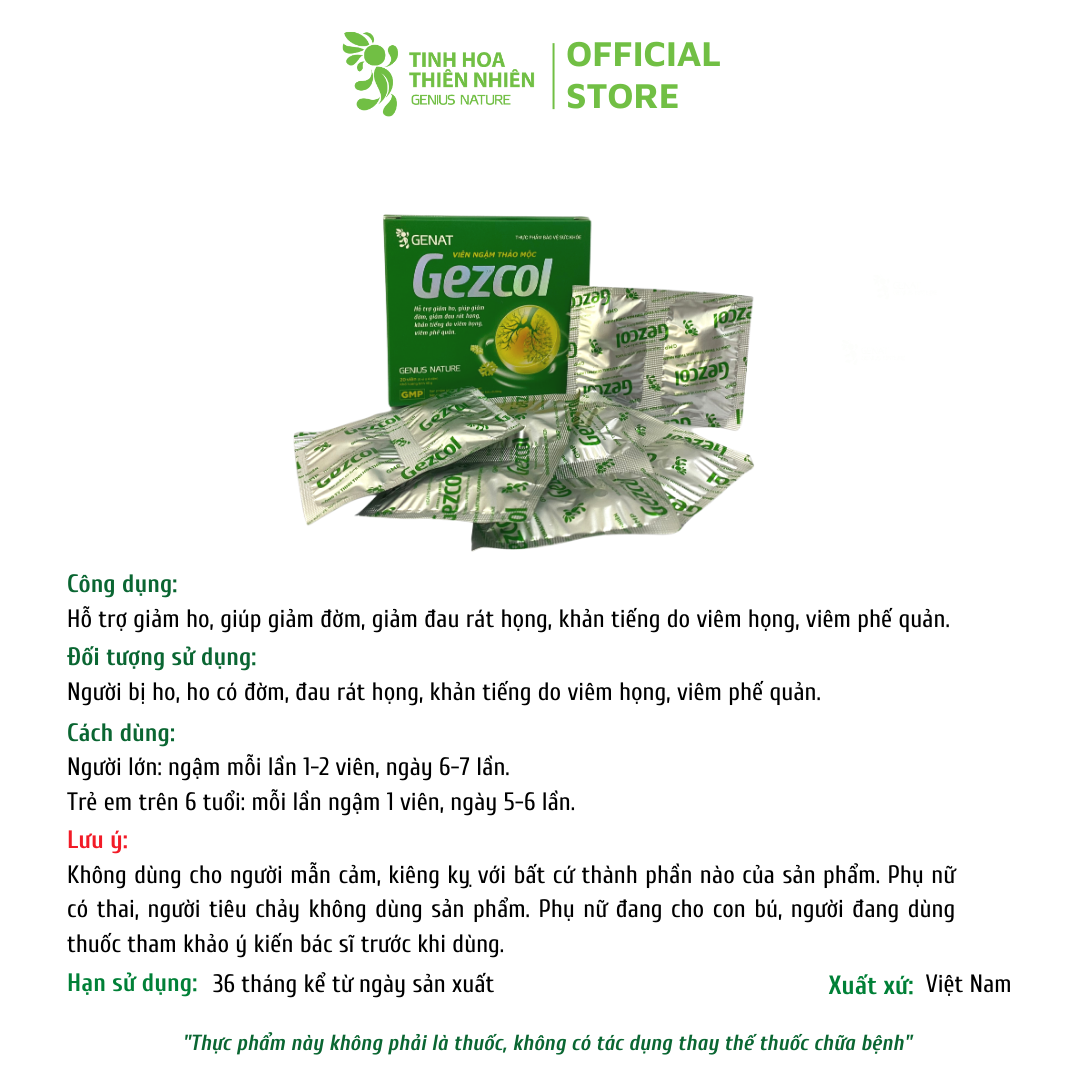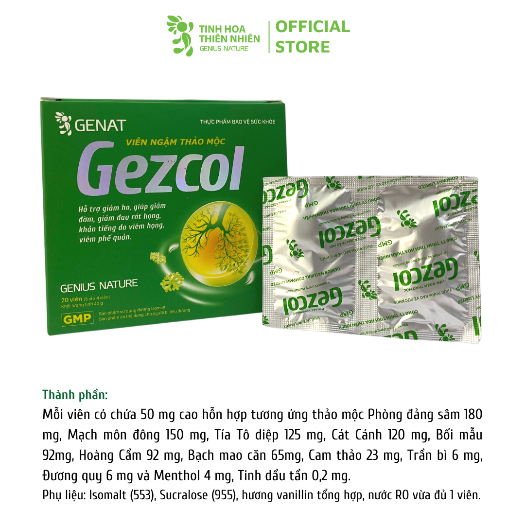 Combo 2 hộp 20 viên - TPBVSK Viên ngậm thảo mộc Gezcol Hỗ trợ giảm ho, giảm đờm, giảm đau rát họng, khản tiếng - Genat