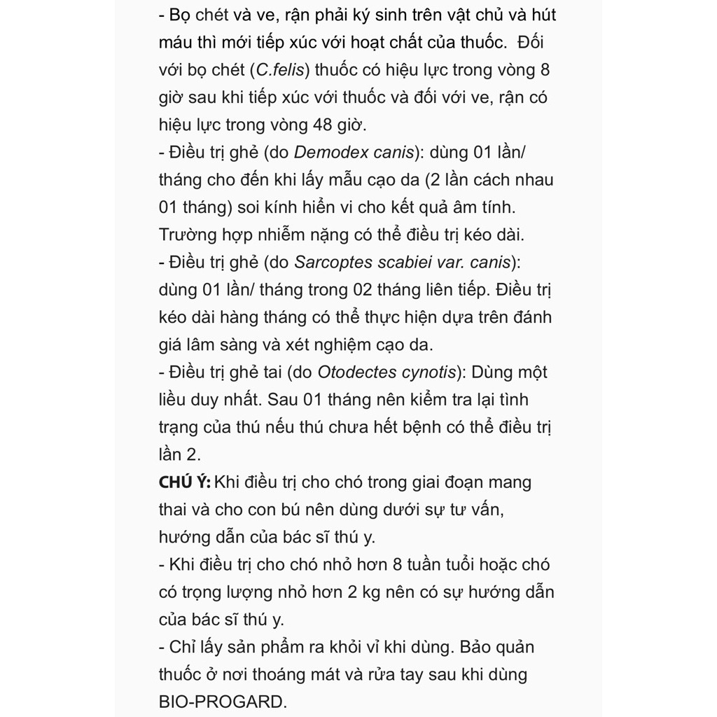 Đối với viêm da do Demodex canis, Sarcoptes scabie: sử dụng mỗi tháng, cho đến khi xét nghiệm da 2 lần cách nhau 1 tháng đều âm tính.