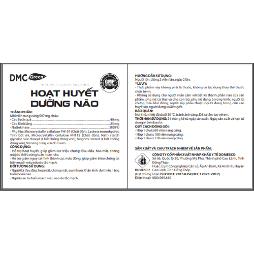 Viên uống HOẠT HUYẾT DƯỠNG NÃO được sản xuất bởi Công ty CP Xuất Nhập Khẩu Y tế DOMESCO đã đạt công nhận về tiêu chuẩn Thực hành tốt Sản xuất Thực phẩm Bảo vệ Sức khỏe do Cục An toàn Thực phẩm cấp phép. Điểm NỔI BẬT của sản phẩm là sự kết hợp độc đáo giữa bộ 3 dược liệu quý đã có các công bố khoa học chứng minh về tính tác động có ý nghĩa lên não bộ của con người.