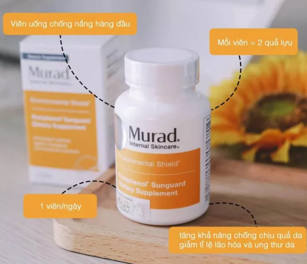 ● Thành phần chính của viên uống chống nắng Murad Pomphenol Sunguard là chiết xuất lựu đỏ, an toàn, lành tính. Sản phẩm cao cấp của Murad - Mỹ được nhiều người nổi tiếng như Đàm Vĩnh Hưng, Hứa Vỹ Văn lựa chọn.