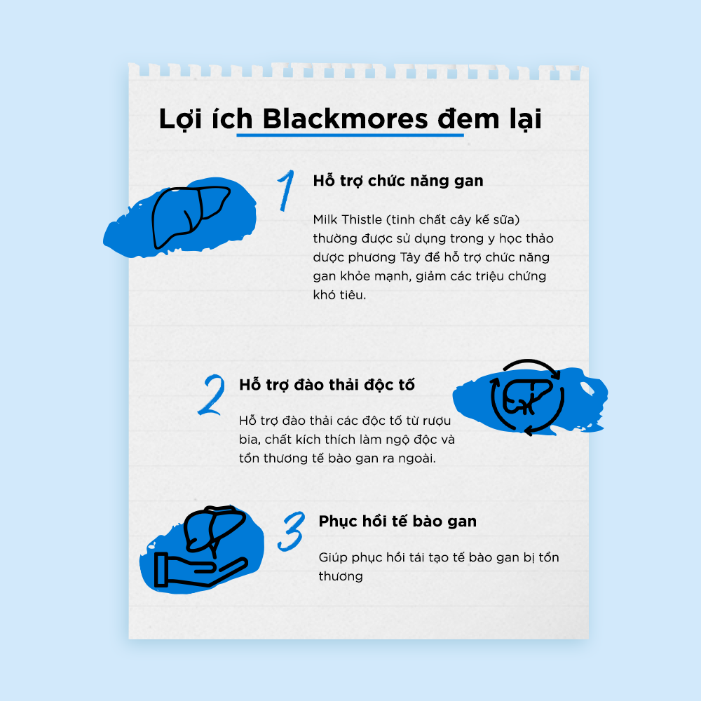 Milk Thistle chứa tinh chất cây kế sữa có tác dụng hỗ trợ bảo vệ gan trước các chất độc hại, hỗ trợ quá trình phục hồi tế bào gan. Ngoài ra, các thành phần có trong Blackmores Milk Thistle còn hoạt động như một chất giải độc các hóa chất tổng hợp khác như acetaminophen đến rượu hoặc kim loại nặng.
