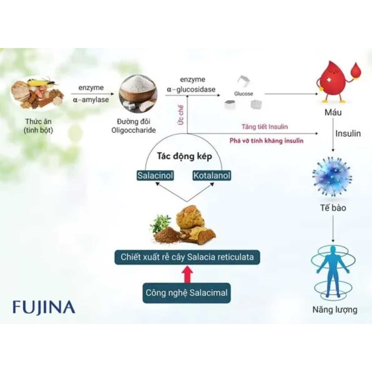 Sản phẩm ứng dụng công nghệ chiết xuất hiện đại Salacimal với tác dụng dược lí kép, không những hạn chế sự gia tăng đường huyết sau ăn mà còn giúp kiểm soát, duy trì ổn định chỉ số đường huyết về ngưỡng an toàn, hạn chế đến mức tối đa những biến chứng của bệnh tiểu đường.