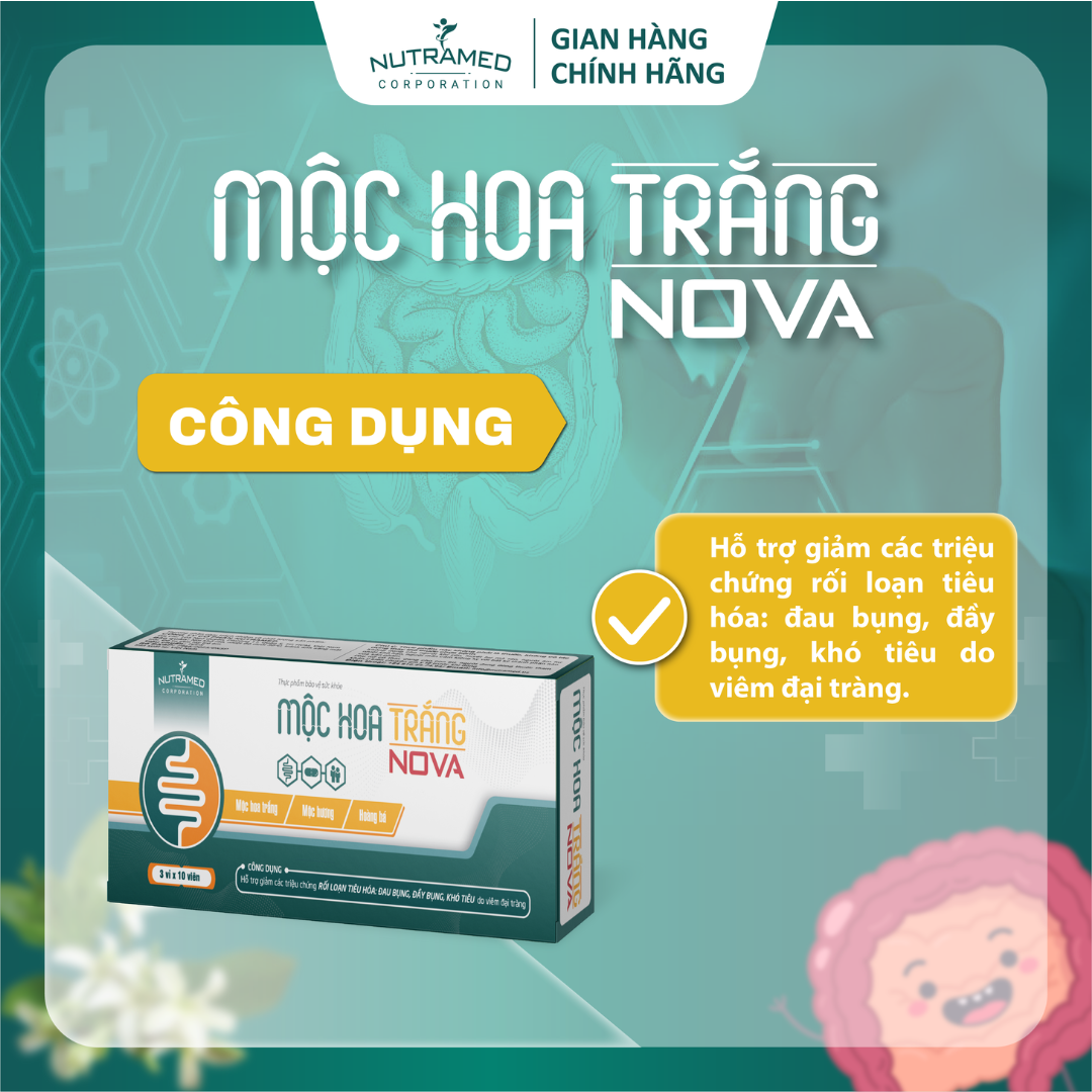 MỘC HOA TRẮNG NO VA - Hỗ trợ giảm rối loạn tiêu hóa do viêm đại tràng   THÀNH PHẦN  ️ Mộc hoa trắng (Holarrhena antidysenteria), Mộc hương (Saussurea lappa), Hoàng bá (Phellodendron chinensis Schneid), Chiết xuất Hoàng liên (Coptis chinensis extract)   CÔNG DỤNG    ️Hỗ trợ giảm các triệu chứng rối loạn tiêu hóa: đau bụng, đầy bụng, khó tiêu do viêm đại tràng   ĐỐI TƯỢNG SỬ DỤNG  ️ Người lớn có biểu hiện rối loạn tiêu hóa do viêm đại tràng   HƯỚNG DẪN SỬ DỤNG  ️  Người lớn: Uống 1 viên/lần x 2 lần/ngày   KHÔNG SỬ DỤNG TRONG TRƯỜNG HỢP ️   Người khí yếu, huyết hư mà táo, âm hư nhiệt khô háo ️   Người mẫn cảm, kiêng kỵ với bất kỳ thành phần nào của sản phẩm   LƯU Ý ️  Thực phẩm này không phải là thuốc, không có tác dụng thay thế thuốc chữa bệnh. ️   Phụ nữ có thai, đang cho con bú, người đang dùng thuốc tham khảo ý kiến chuyên gia y tế trước khi dùng   BẢO QUẢN   ️  Nơi khô mát, tránh ánh nắng mặt trời.Nhiệt độ dưới 30°C.Để xa cầm tay trẻ em.   THÔNG TIN SẢN PHẨM Tên sản phẩm: Mộc hoa trắng no va Quy cách đóng gói: Hộp 3 vỉ x 10 viên/Hộp 10 vỉ x 10 viên. Hạn sử dụng: 36 tháng Tiêu chuẩn: TCCS   _ NUTRAMED - KHƠI NGUỒN KHOA HỌC TỚI CUỘC SỐNG   Nhà máy đạt chuẩn WHO – GMP. Nguyên liệu được kiểm tra chất lượng khắt khe bởi nhà máy đạt chuẩn GMP.