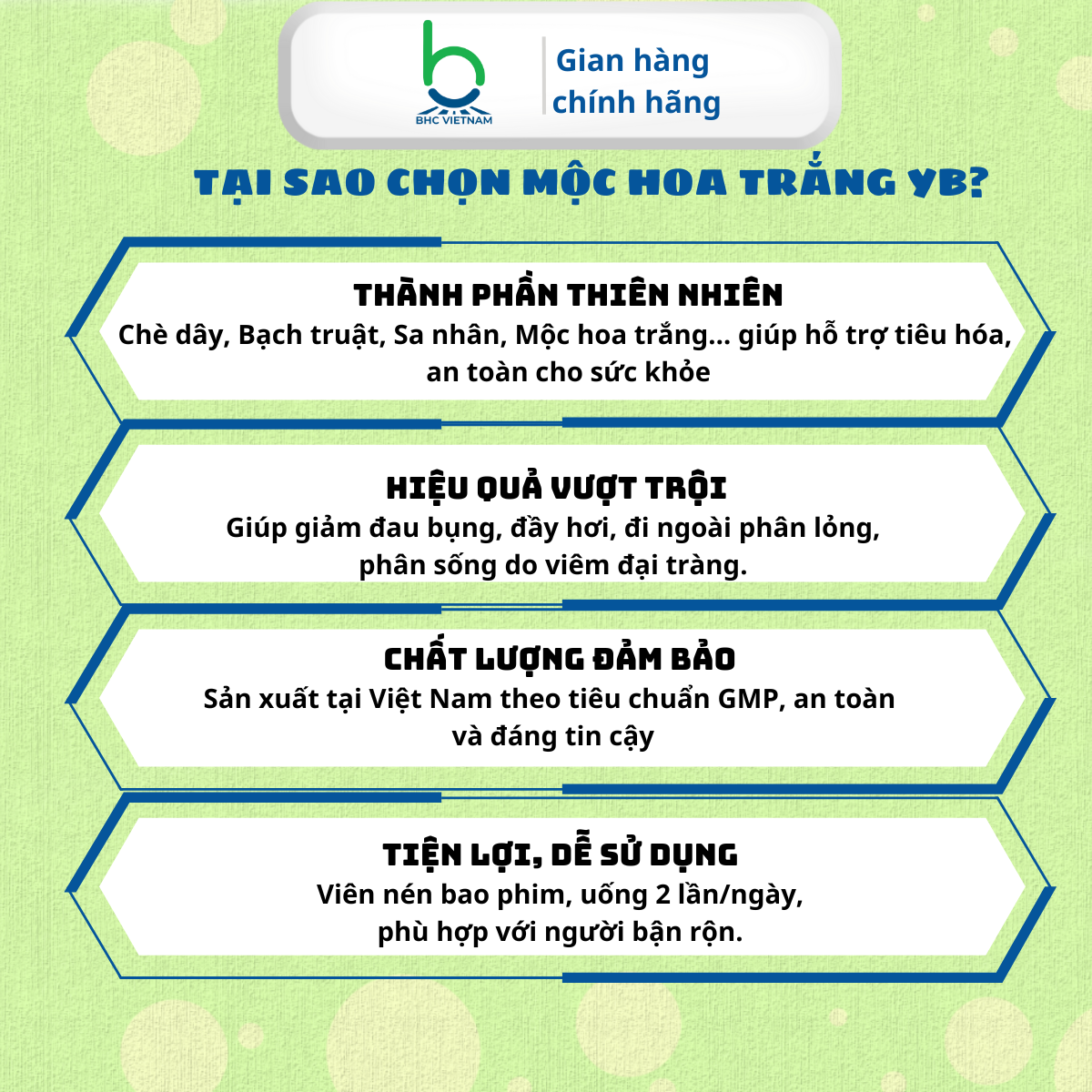 Viên Uống MỘC HOA TRẮNG YB Hỗ Trợ Rối Loạn Tiêu Hóa, Viêm Đại Tràng - Lọ 60 viên Công dụng nổi bật Hỗ trợ giảm các triệu chứng rối loạn tiêu hóa như: đau