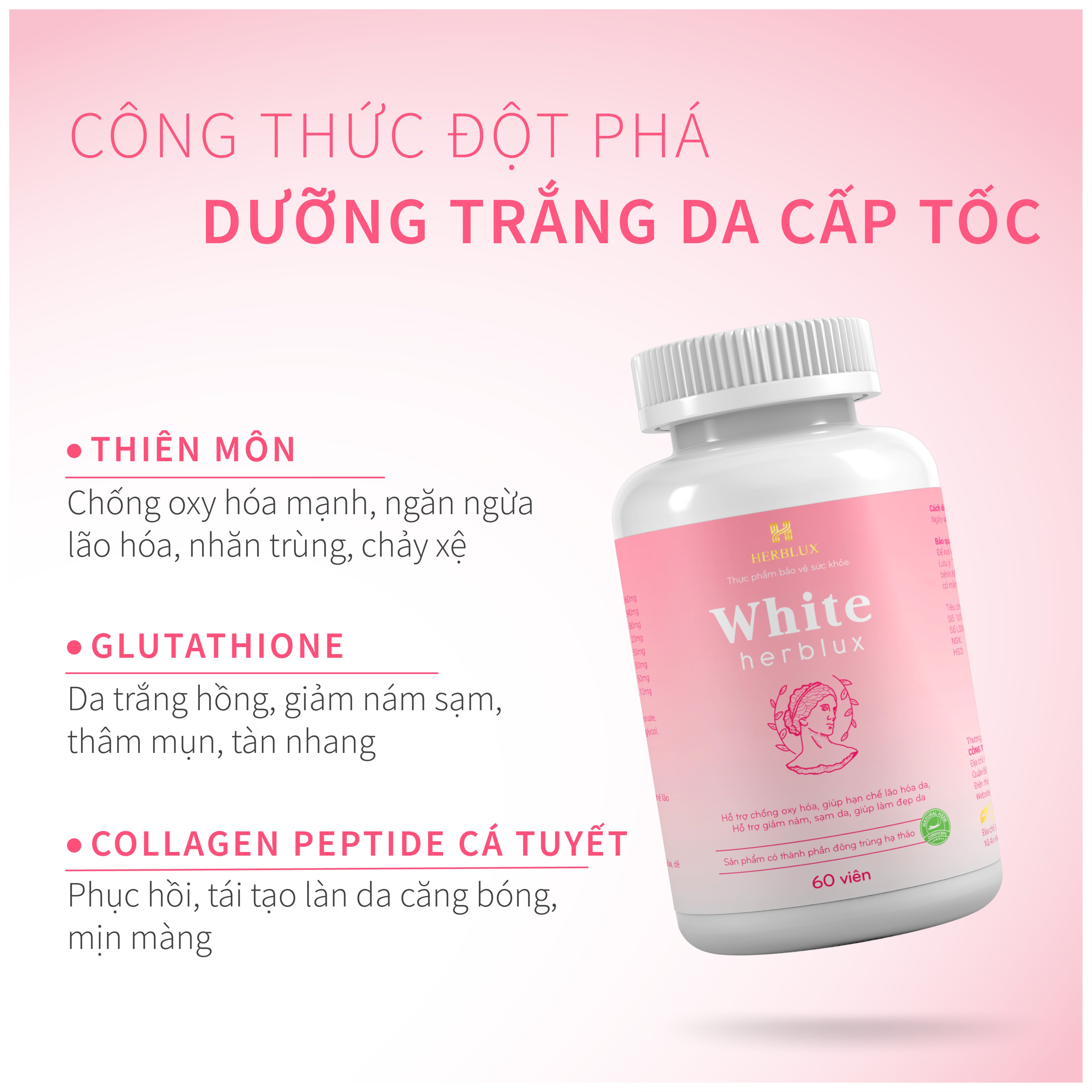 Viên uống trắng da White Herblux được phân phối rộng rãi tại các Spa trên toàn quốc với công dụng TRẮNG HỒNG DA, SÁNG MỊN DA, GIẢM NÁM SẠM, MỜ THÂM MỤN, bổ sung COLLAGEN, tăng cường NỘI TIẾT TỐ NỮ.