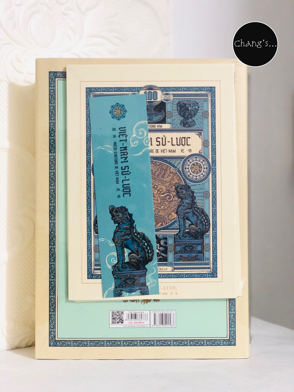 Ấn bản cao cấp Việt Nam sử lược có bìa cứng, ruột in 2 màu trên giấy GV76-BB định lượng 100gsm, quà tặng kèm gồm bản đồ, bookmark và bộ postcard 8 tấm.