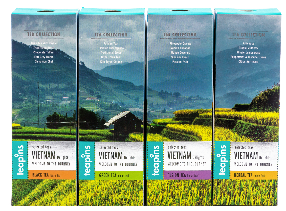 Vietnam Delights Collection. Đó là 5 loại trà độc đáo từ các vùng khác nhau của Việt Nam trong một hộp, có thể ngắm nhìn toàn cảnh những góc đẹp nhất của đất nước. Chúng tôi đã khám phá Việt Nam từ Bắc vào Nam để tìm ra những trang trại trà tốt nhất và thu thập những loại trà tốt nhất cho bạn trong một hộp. Mỗi túi trà được đóng gói kín đáo, cho phép lưu giữ tất cả các lợi ích sức khỏe và hương vị tuyệt vời. Các mô tả về các giống trà và các khuyến nghị về cách pha được ghi chi tiết trên bao bì.