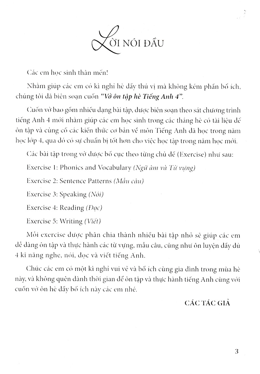Với mục đích nhằm giúp các em học sinh trong các tháng hè có tài liệu để ôn tập và củng cố các kiến thức cơ bản về môn Tiếng Anh đã học trong năm học , qua đó có sự chuẩn bị tốt hơn cho việc học tập trong năm học mới, chúng tôi đã biên soạn cuốn Vở ôn tập hè Tiếng Anh 4.