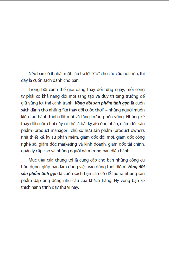 Trong bối cảnh thế giới đang thay đổi từng ngày, mỗi công ty phải có khả năng đổi mới sáng tạo và duy trì tăng trưởng để giữ vững lợi thế cạnh tranh. Vòng đời sản phẩm tinh gọn là cuốn sách dành cho những “kẻ thay đổi cuộc chơi” – những người muốn kiến tạo hành trình đổi mới và tăng trưởng bền vững. Những kẻ thay đổi cuộc chơi này có thể là bất kỳ ai: công nhân, giám đốc sản phẩm (product manager), chủ sở hữu sản phẩm (product owner), nhà thiết kế, kỹ sư phần mềm, giám đốc đổi mới, giám đốc công nghệ số, giám đốc marketing và kinh doanh, giám đốc tài chính, quản lý cấp cao và những người nằm trong ban điều hành.