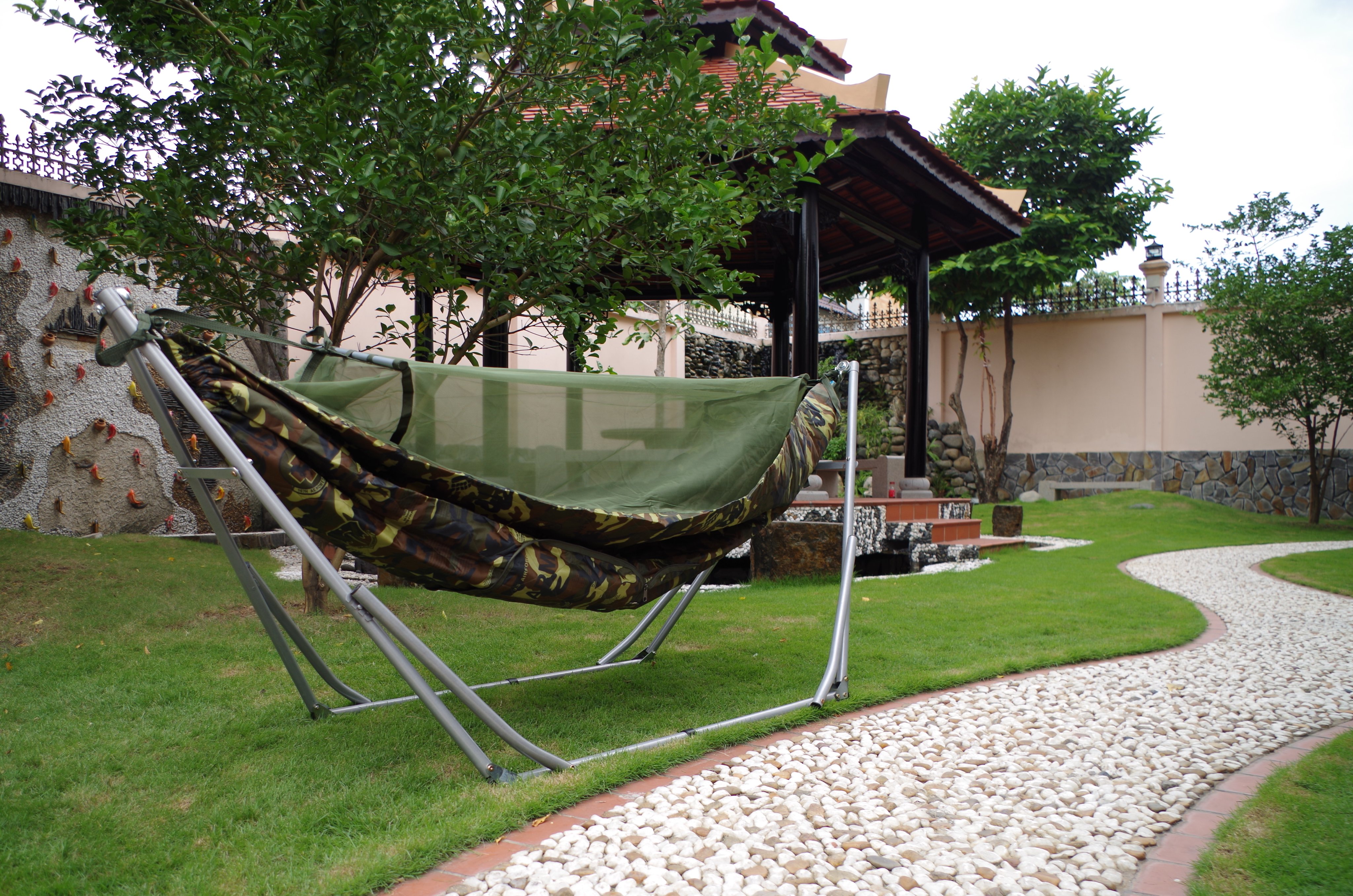 * Khung võng xếp bằng ống thép: sơn tĩnh điện, đường kính 32.0mm, chiều dày 0.7mm,4 thanh chống cong:điều chỉnh độ dài & độ cao của khung võng. * Kích thước sử dụng: trung bình