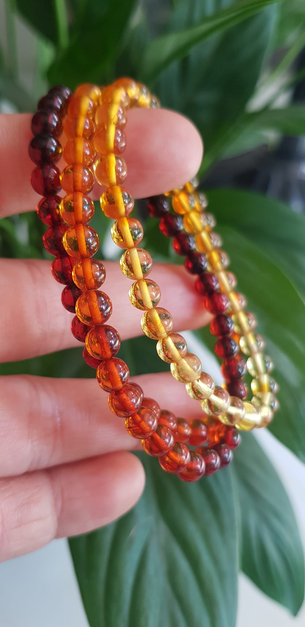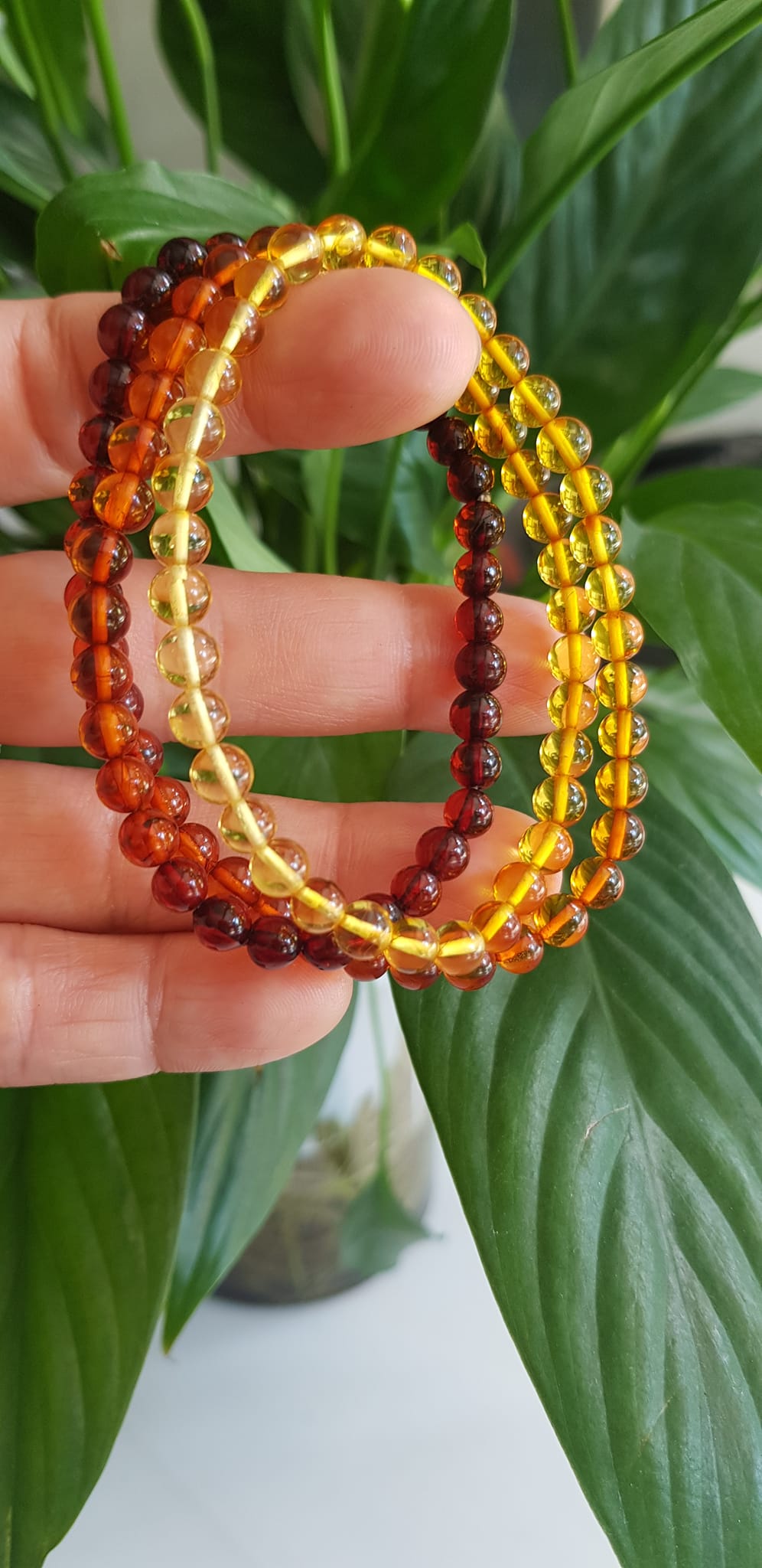 Vòng Hổ Phách tự nhiên đeo quấn tay kiểu 3 vòng có 3 màu tam hợp là màu vàng, cam và đỏ đậm, tạo nên sự hài hòa và cân đối cho sản phẩm.