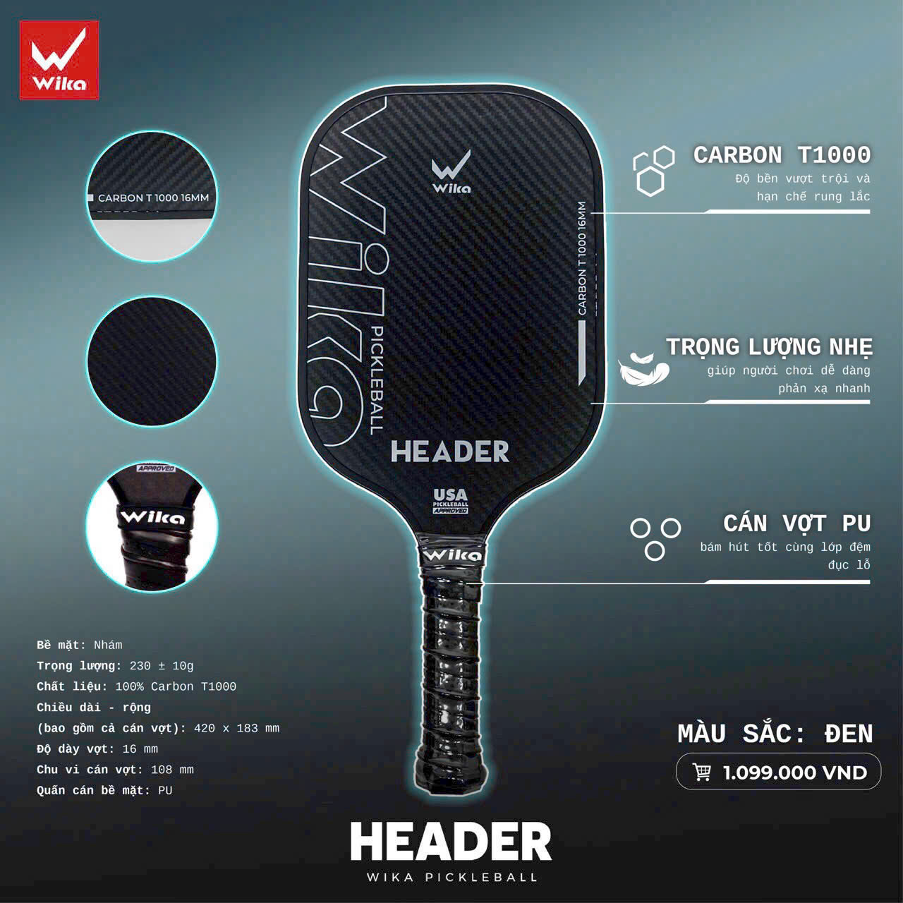 Dòng vợt Pickleball ĐẦU TIÊN sử dụng chất liệu Carbon T1000, Header sở hữu độ chi tiết cao trên từng vị trí mặt vợt - tăng độ chính xác trong từng cú đánh.