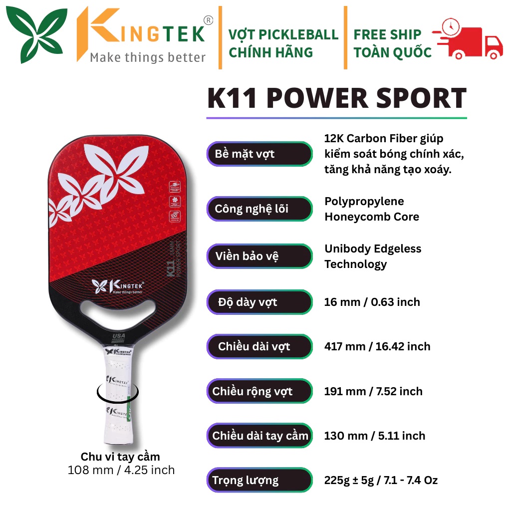 1/ Giới thiệu về Vợt Pickleball Kingtek K11 Power Sport Thông số / Specifications - Chi tiết / Details Chiều dài vợt: 417 mm / 16.42 inch Chiều rộng vợt: 191 mm / 7.52 inch Độ dày vợt: 16 mm / 0.63 inch Chiều dài tay cầm: 130 mm / 5.11 inch Chu vi tay cầm: 108 mm / 4.25 inch Trọng lượng: 225g ± 5g / 7.1-7.4 Oz Bề mặt vợt: 12K Carbon Fiber Lõi vợt: Lõi tổ ong PP / Polypropylene Honeycomb Core Viền bảo vệ: Không viền, liền khối / Unibody edgeless technology Nhà sản xuất: Kingtek Sản xuất tại: Trung Quốc / China