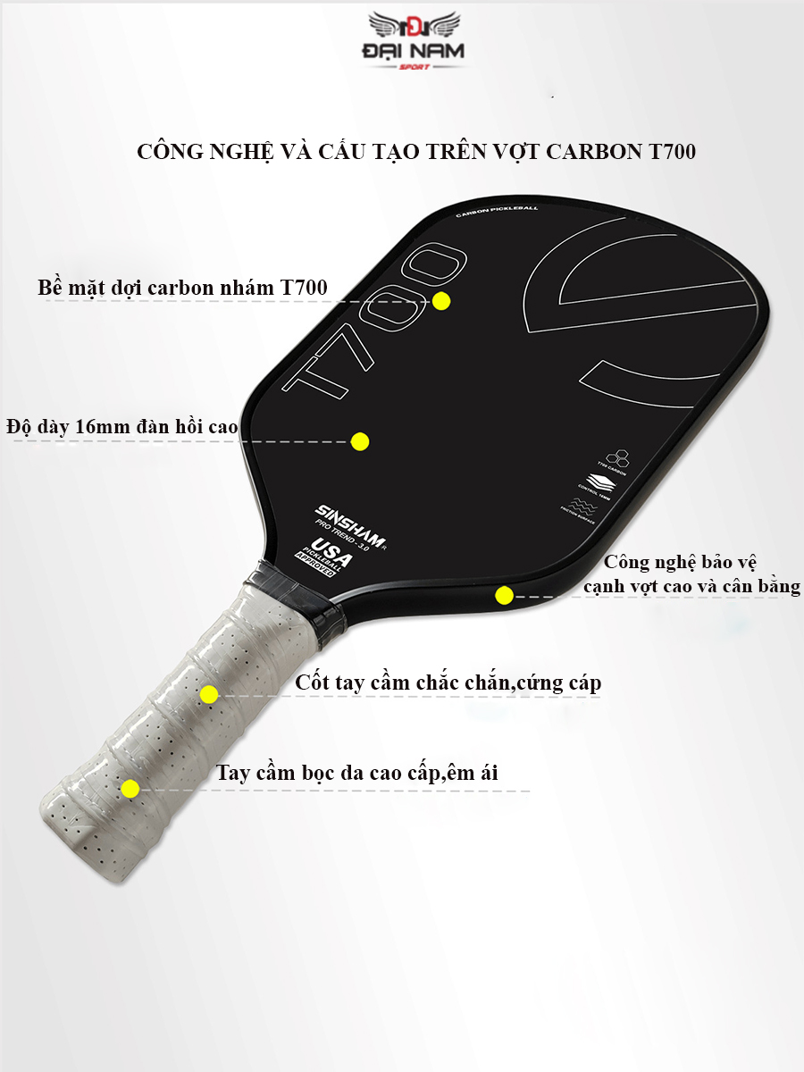 *THÔNG TIN CHI TIẾT VỀ VỢT PICKLEBALL T700 CARBON MẶT NHÁM. - Thương hiệu: Đại Nam Sport. - Mã sản phẩm: T700. - Mà sắc: Đen. - Trọng lượng: 220G ± 5G - Độ dày vợt pickleball