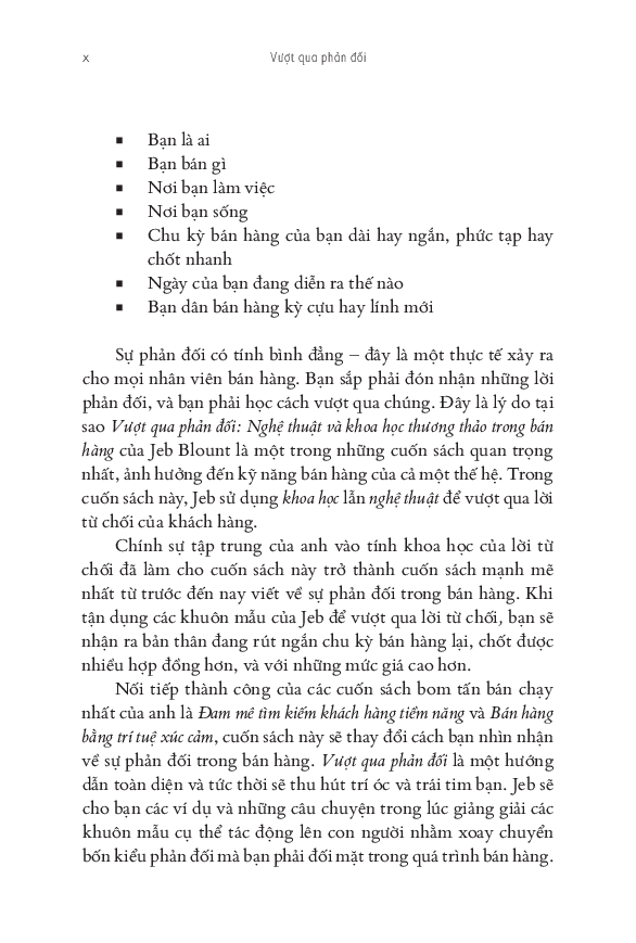 Trong quyển sách này, bạn sẽ không tìm thấy này những kỹ thuật cũ kỹ. Mà thay vào đó, bạn sẽ học được tâm lý học mới để vượt qua phản đối và các kỹ thuật phù hợp với khách hàng ngày nay, những người vốn có nhiều thông tin, có quyền kiểm soát và hoài nghi hơn.