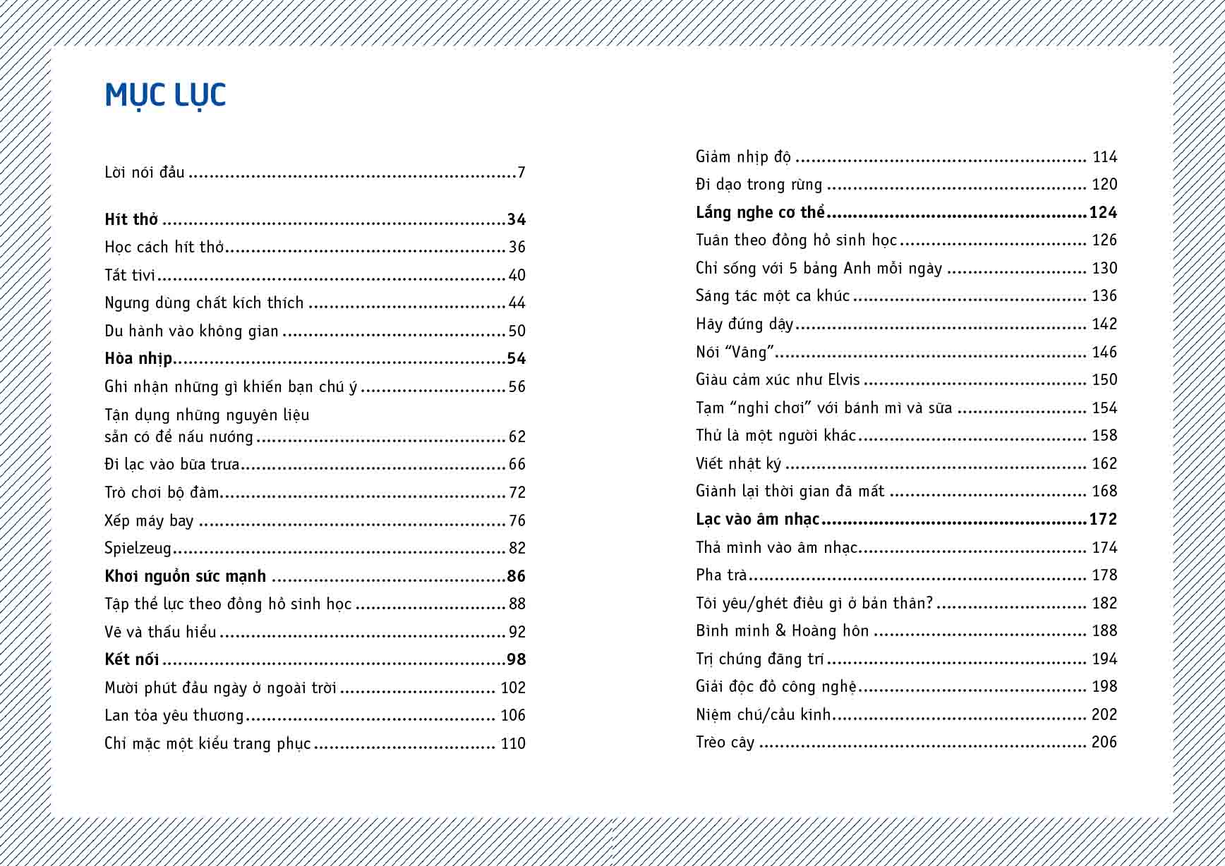 Cuốn sách bao gồm 56 lời gợi ý được chia ra thành các chủ đề: Hít thở, hòa nhịp, khơi nguồn sức mạnh, kết nối, lắng nghe cơ thể, lạc vào âm nhạc. Mỗi lời gợi ý được cấu trúc thành 3 phần: Góc nhìn mới, kế hoạch thực hiện, thành quả và một góc ghi chú cho bạn đọc.