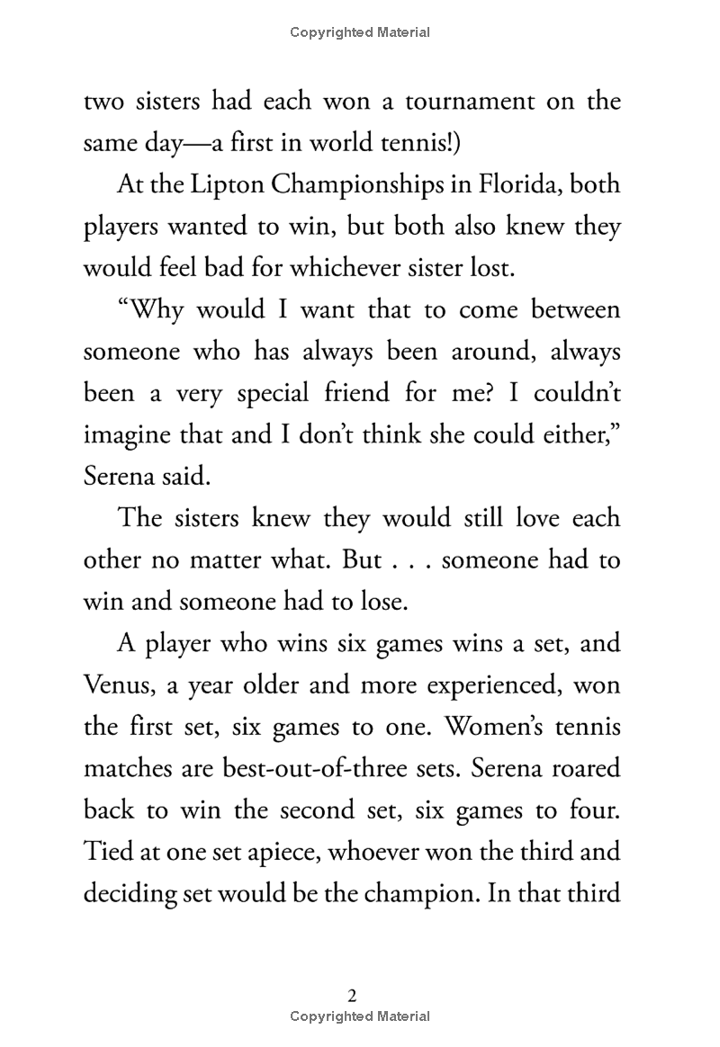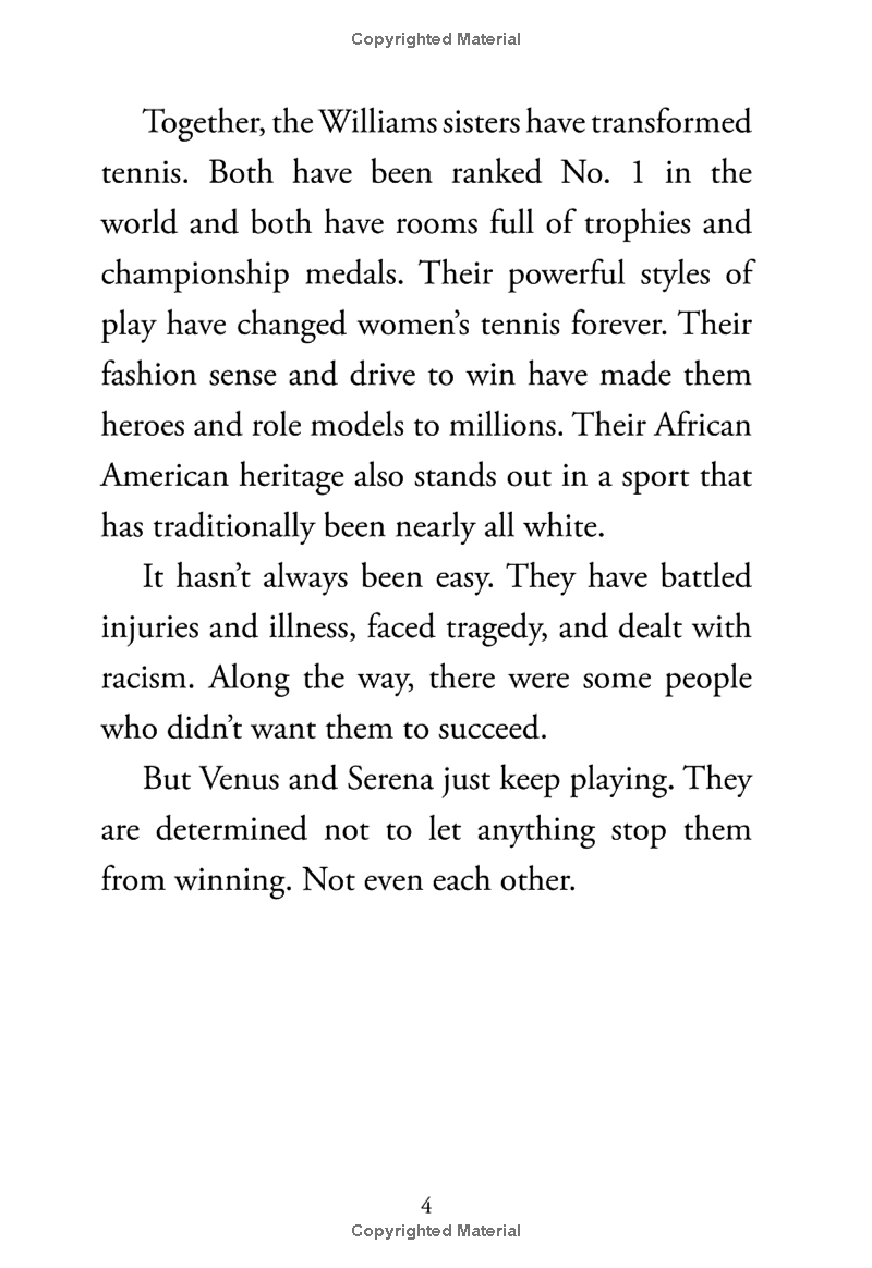The dynamic story of the Williams sisters, both top-ranked professional tennis players. Venus and Serena Williams are two of the most successful professional American tennis players of all time. Coached at an early age by their parents, the sisters have both gone on to become Grand Slam title winners. They have both achieved the World Number One ranking in both singles and doubles! Although completely professional and fiercely competitive, the sisters remain close. Who Are Venus and Serena Williams? follows the pair from their early days of training up through the ranks and to the Summer Olympic Games, where they have each won four gold medals--more than any other tennis players. This title in the New York Times best-selling series has eighty illustrations that help bring the exciting story of tennis champs Venus and Serena Williams to life.