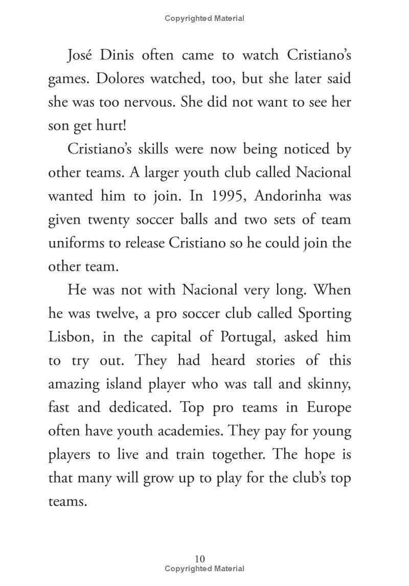 When he was just twelve years old, Cristiano Ronaldo was recruited to play professional soccer for a team in Portugal, 600 miles from his home on the island of Madeira, a region of Portugal. For the next twenty-five years, Cristiano would prove to the world that he is one of the greatest to ever play the game. Author James Buckley Jr. takes readers through each exciting moment--from his first championship with Manchester United to each of his five Ballon D'or award-winning seasons.