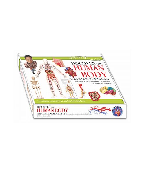 Wonders of Learning discover the human body educational model set. This guide to human anatomy for children includes a reference book, sticker book, wall chart and model skeleton kit. Fun and informative for young biology fans.
