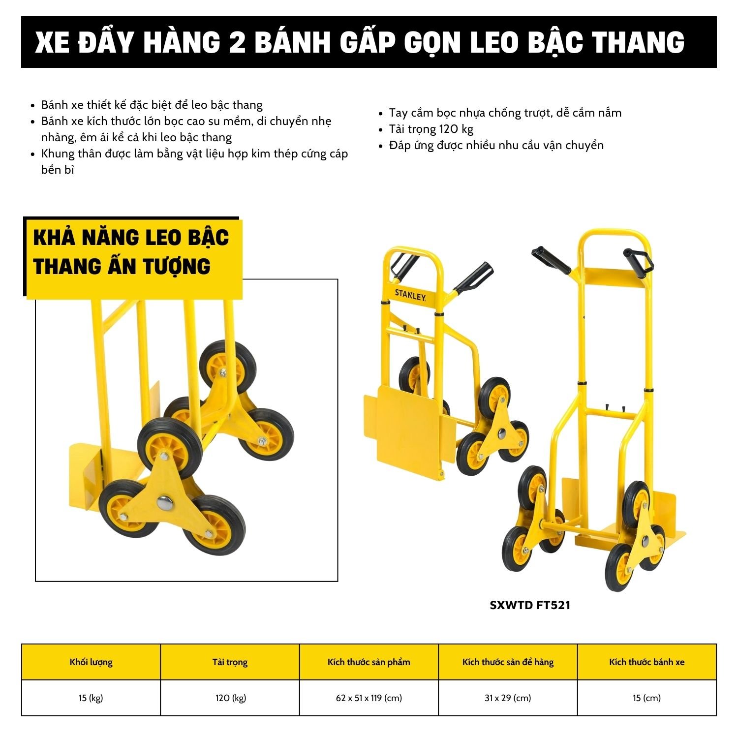 Xe đẩy hàng leo cầu thang Stanley FT521 đến từ thương hiệu Stanley nổi tiếng toàn cầu. Sản phẩm này sẽ là trợ thủ đắc lực giúp bạn vận chuyển hàng hóa lên xuống cầu