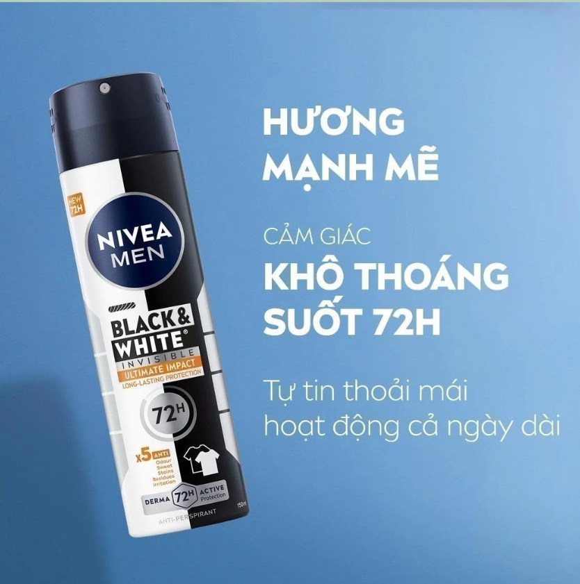 Xịt ngăn mùi NIVEA MEN ngăn ố vàng vượt trội (150ml) – 85388 Giờ đây, đã có bí quyết giúp phái mạnh tự tin hơn khi mặc sơ mi trắng, không lo ố vàng vùng dưới cánh tay khi sử dụng Lăn khử mùi. Phiên bản mới từ Xịt ngăn mùi NIVEA MEN – Ngăn ố vàng vượt trội với công thức tiên tiến giúp giảm hình thành vệt ố vàng trên áo. Giúp giảm tiết mồ hồi và khử mùi hiệu quả suốt 48 giờ với mùi hương nam tính, mạnh mẽ. Với công thức độc quyền từ NIVEA, Xịt ngăn mùi NIVEA MEN Invisible For Black And White chăm sóc toàn diện vùng da dưới cánh tay, mang lại hương thơm thanh mát tự tin suốt cả ngày dài với 5 tác động giúp: