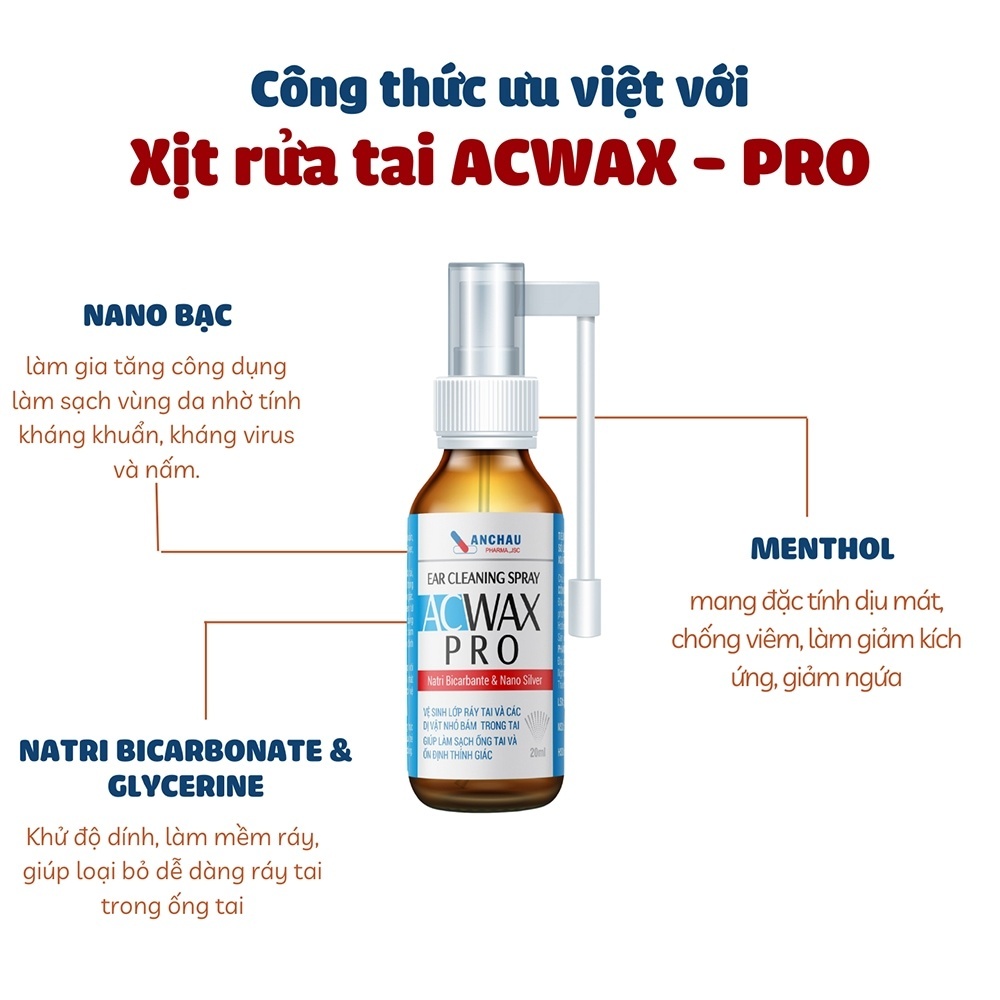 Mua tại TiktokXỊT RỬA TAI ACWAX PRO CHO TRẺ EM VÀ NGƯỜI LỚN Xịt rửa tai Acwax Pro là sản phẩm an toàn và hiệu quả cho việc làm sạch tai của trẻ em từ 3 tuổi trở lên và người lớn. Sản phẩm giúp vệ sinh lớp ráy tai và loại bỏ các dị vật nhỏ có thể bám trong tai, từ đó giúp duy trì sạch sẽ và ổn định thính giác. Thành phần chính của xịt rửa tai Acwax Pro An Châu bao gồm Natri bicarbonate và Glycerine, giúp làm mềm ráy tai để dễ dàng loại bỏ. Sự kết hợp với Nano bạc và Methol cung cấp công dụng làm sạch mạnh mẽ, đồng thời giúp giảm ngứa tai hiệu quả. Với chỉ một thao tác xịt đơn giản, sau đó đợi trong vòng 1 phút và lau sạch bằng bông mềm, bạn đã có thể loại bỏ lớp ráy tai và các dị vật nhỏ trong tai mà không gây tổn thương cho màng nhĩ. Đây thực sự là một giải pháp tiện lợi và an toàn cho việc vệ sinh tai hàng ngày. CÔNG DỤNG