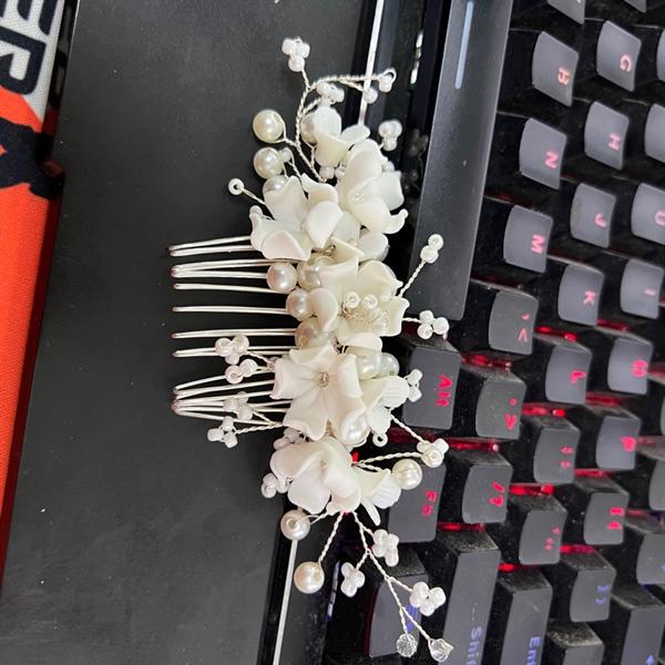Trâm cài tóc cô dâu thiết kế ngọc trai và hoa 5 canh mềm mại, nữ tính. Tôn lên vẻ đẹp cho mái tóc xinh. Thích hợp trang điểm, make up cô dâu, trang điểm