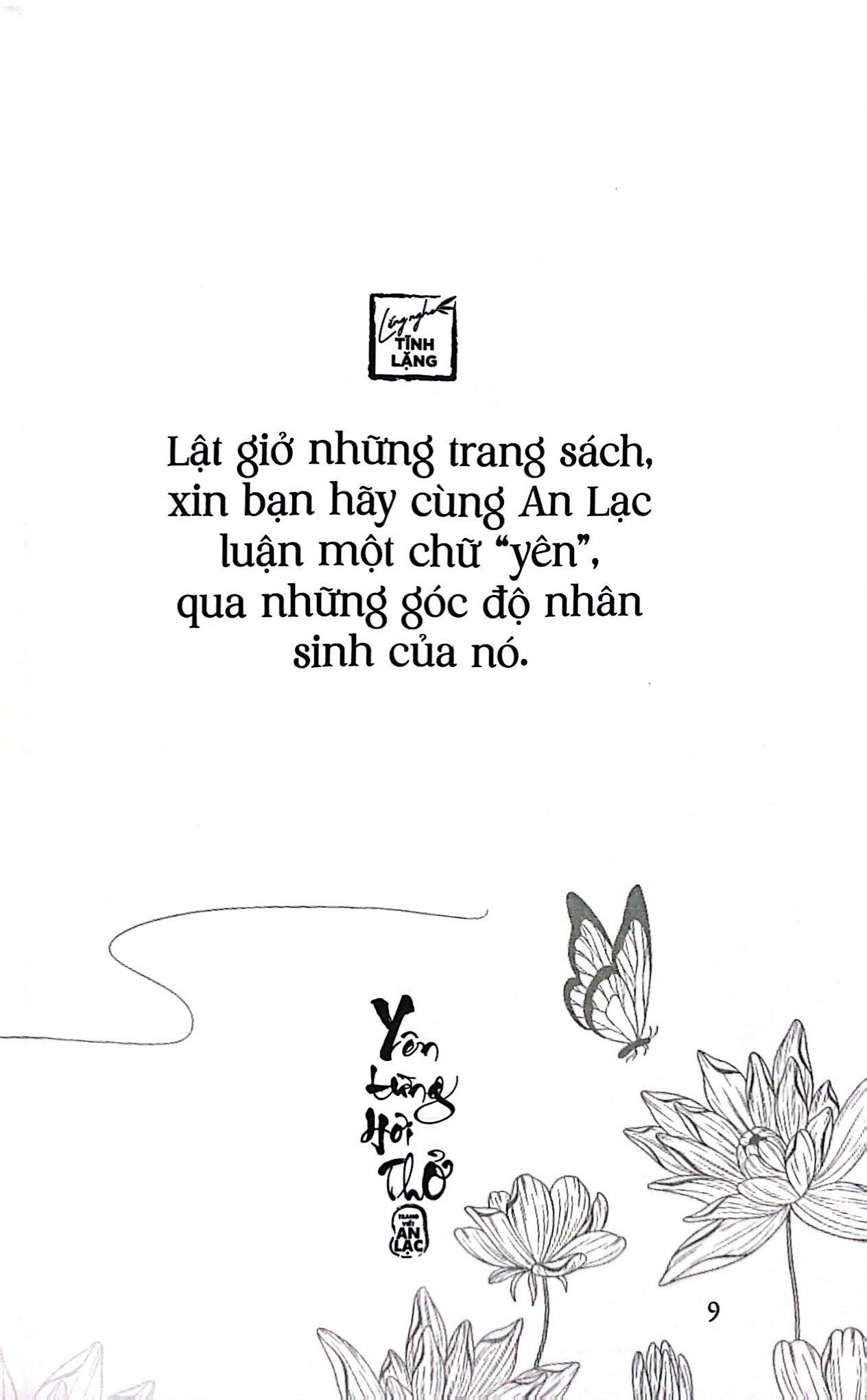 “Yên là tĩnh tại trong lòng. Không vướng bận, không sầu muộn. Là nhận biết vạn vật, trìu mến khoan hòa với vạn vật. Trong “yên” có cả thư thái, bình an và thích nghi”. Chúng ta thường hờn trách thế giới, than khóc với trời xanh vì sao tệ bạc với số mệnh của m.ình khi rơi vào những hoàn cảnh ngặt nghèo, bất hạnh. Chúng ta ganh ghét, đố kị với những sinh mệnh may mắn và hạnh phúc hơn, trong khi chúng ta thì ngược lại. Lòng chúng ta mơ lớn, luôn muốn cuộc sống dễ dàng hơn với chính m.ình nhưng ta lại chưa từng yêu lấy thế giới. Tâm chưa đủ rộng, lòng chưa đủ dày và khoan dung với vạn vật thì hà cớ gì ai ai cũng mong cầu được thế giới đối xử nhẹ nhàng. Người ta thường nói, cách bạn nhìn nhận mọi thứ xung quanh sẽ quyết định chữ an, chữ yên trong tâm bạn. Vì thế, nếu bạn muốn lòng vẫn bình tâm, tĩnh lặng trước bão giông thì hãy mở rộng tâm hồn để đón nhận vạn vật trong sự chan hòa và yêu thương. “Yên từng hơi thở, chính là đi tìm và hiểu thế giới theo cách của thế giới. Là mỗi phút mỗi giây đều mở rộng tâm hồn. Vì mở rộng tâm hồn mà được ung dung. Vì biết cách nhìn, biết hiền từ mà mọi điều chảy vào tâm tư đều luôn nhẹ nhàng.” (Trích “Yên từng hơi thở”)